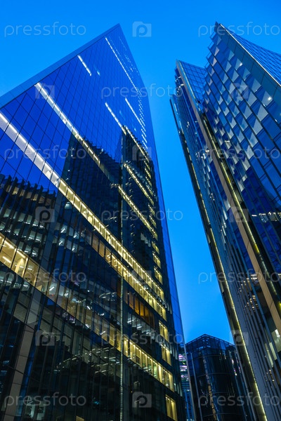 Драматический низкоугольный снимок современных стеклянных небоскребов в синий час с освещенными окнами, отражениями и гладкими линиями, захватывающими энергию процветающего делового района