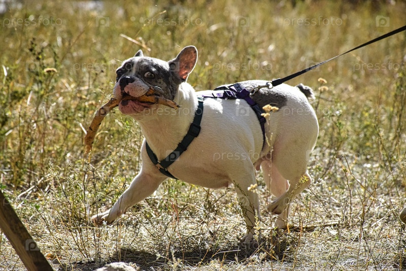 Забавная порода собак Французский бульдог держит палку в зубах