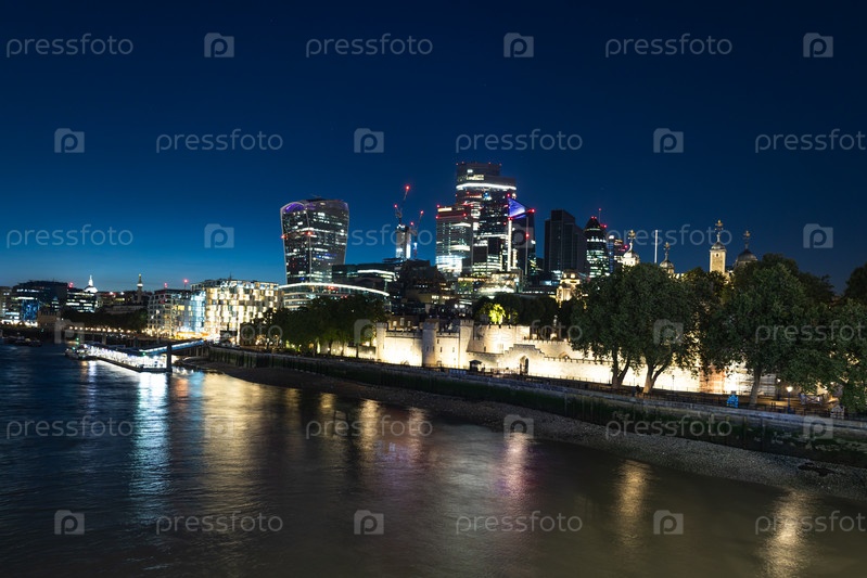 Панорама голубого часа на берегу реки Лондон, освещенные небоскребы и исторические здания, отражающие Темзу