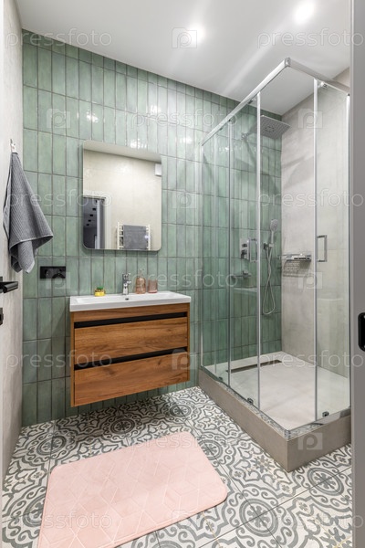 Современная ванная комната с зелеными плитками и деревянной тщеславием