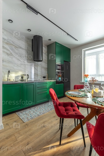 Современный кухонный интерьер с зелеными шкафами и красными бархатными стульями