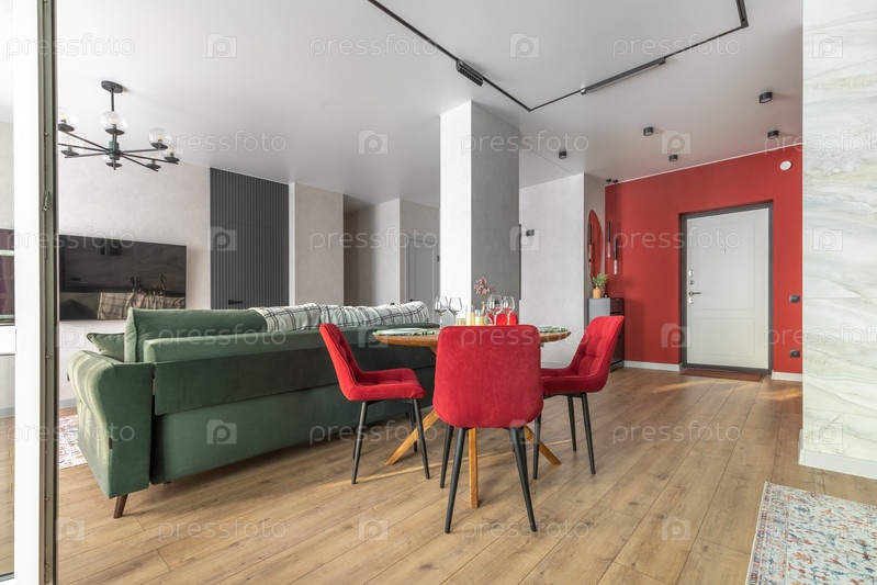 Стильный интерьер квартиры с открытым пространством со зеленым диваном, красными стульями, деревянным полом и современным освещением создает уютную атмосферу