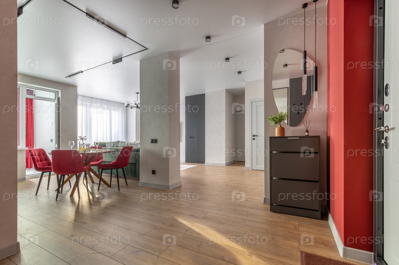 Открытый интерьер квартиры с современным дизайном и теплым деревянным полом