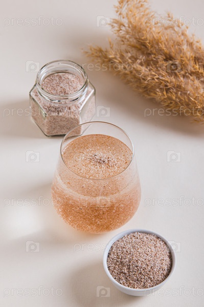 Псилла в стакане воды, в миске в банке на столе вертикальный вид