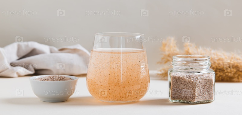 Стакан воды и кожура псиллиума на столе для веб-баннера о здоровье