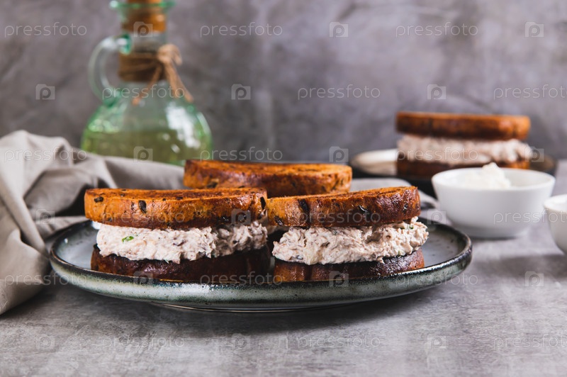 Сэндвичи на жареном зерновом хлебе с салатом из тунца и сливочным сыром на тарелке на столе