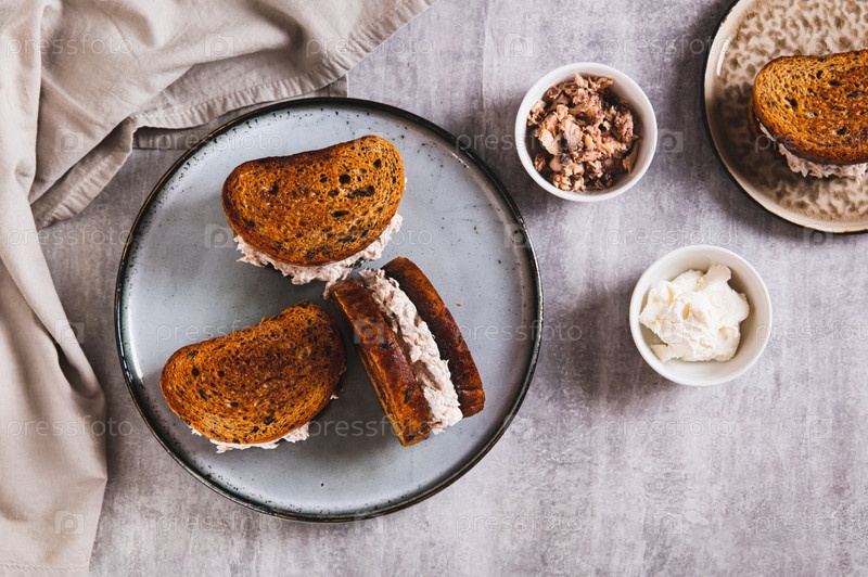 Сэндвичи на жареном зерновом хлебе с салатом из тунца и сливочным сыром наверху тарелки