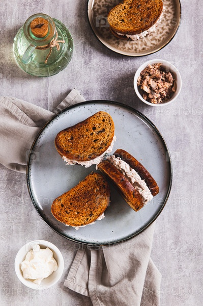 Салат из рикоты и тунца на хлебном гамбургере на тарелке на столе с вертикальным видом