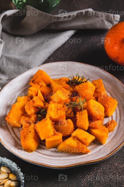 Жареный тыквенник с розмарином на тарелке На столе вертикальный вид