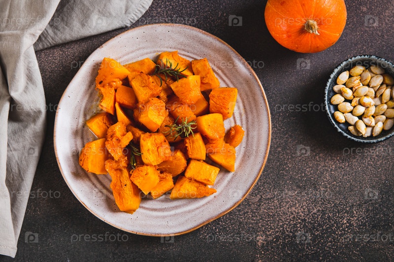 Кусочки запеченной тыквы с розмарином на тарелке с видом на верхнюю часть стола