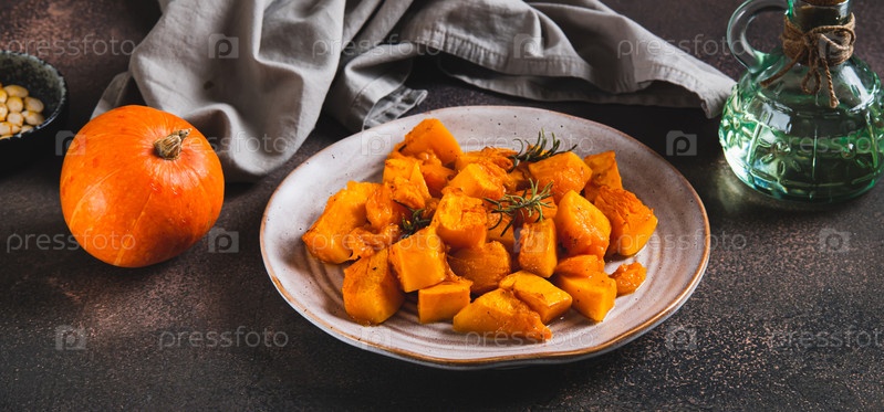 Кусочки запеченной тыквы с розмарином на тарелке на столе WEB баннер
