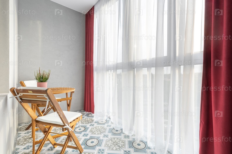 Яркий балкон с деревянной мебелью и красными шторами
