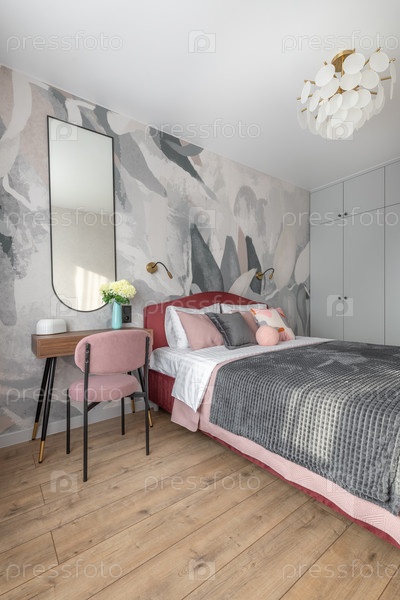 Стильные спальни с розовым и серым декором, деревянным полом, элегантными обоями и уютной атмосферой, которая создает современный интерьер