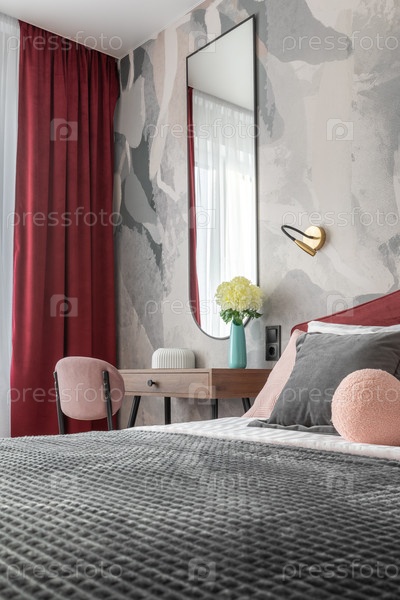 Элегантный интерьер спальни с розовым креслом, красными шторами, деревянным столом и мягкими текстилями создает теплую современную атмосферу