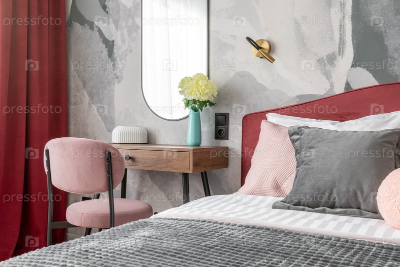 Современная спальня с розовым креслом, серыми подушками, деревянным столом и художественными обоями создает теплую стильную атмосферу