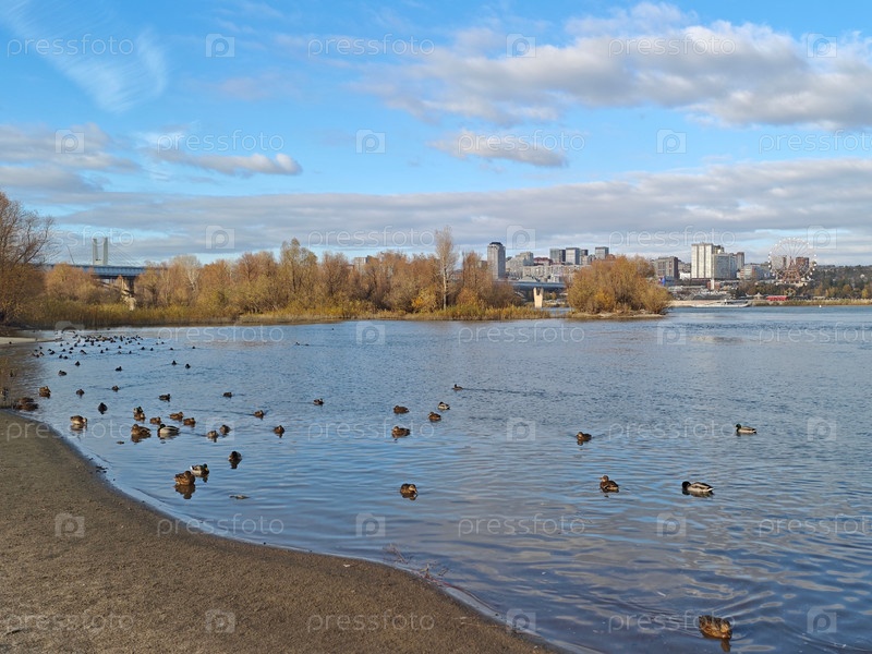 Utki of beregu rivers Обь годе Novosibirsk with vidom on the coleso sights and pylony four-way bridge. Ducks on the banks of the Ob River in Novosibirsk with a view of the Ferris wheel and the pielons of the fourth bridge