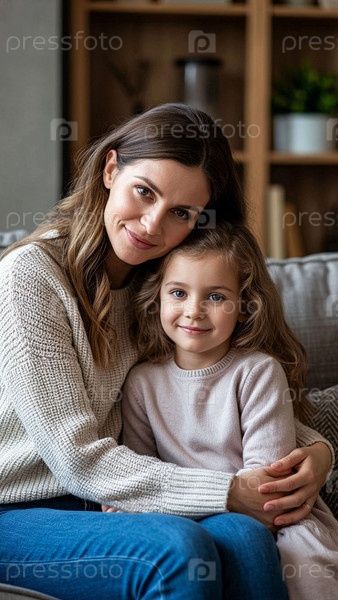 Женщина обнимает своего маленького ребенка, сидящего на диване дома