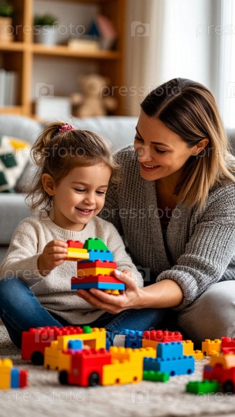 Мама играет с ребенком дома в дизайнере, сидящем вместе на полу гостиной