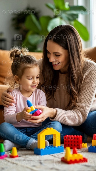 Мама и дочь играют вместе в дизайнерском доме, сидя на полу в гостиной