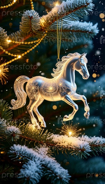 Символ года, стеклянный конь в форме игрушки рождественской елки висит на ветке елей