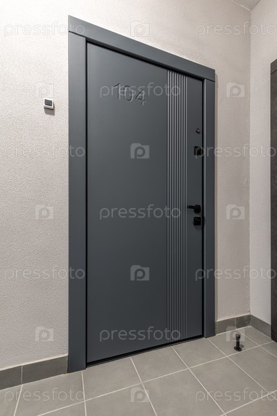 Стильный современный вход в квартиру с мато-серой отделкой и минималистичными геометрическими деталями в современном интерьере коридора