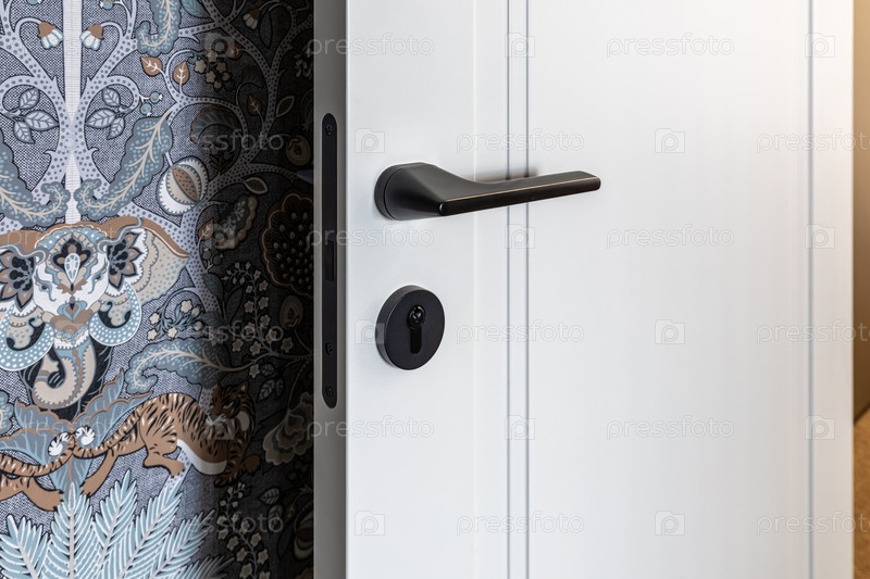 Близкий план современной белой двери с гладкой черной ручкой на стене, покрытой художественными рисунками обоев