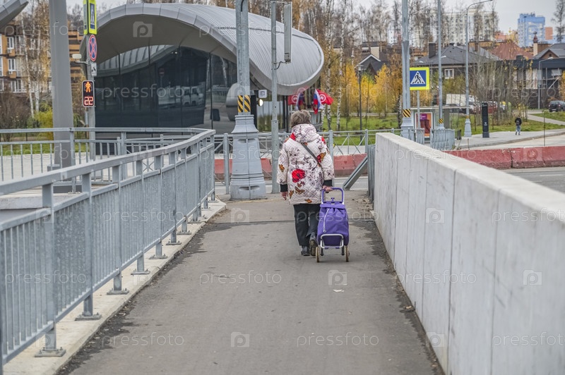 Женщина с тележкой идет по мосту
