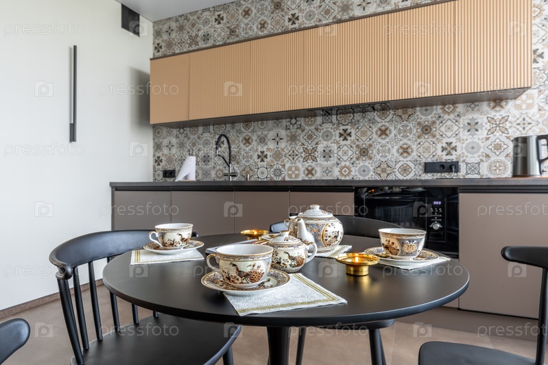 Элегантный фарфоровый чай с чашками и чайником на черном столе в ярком современном кухонном интерьере