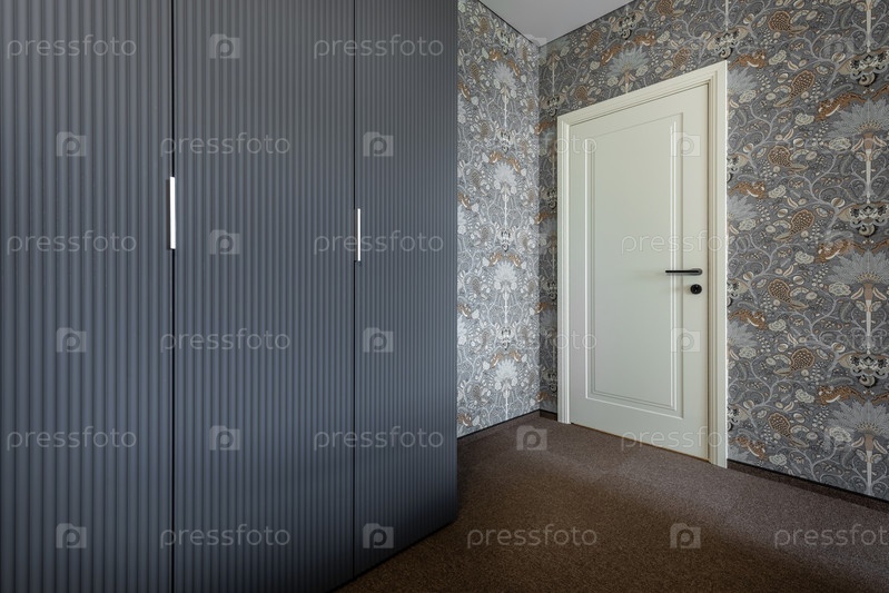 Минималистический интерьер спальни с темным ребровым гардеробом, рисунковой обои и белой дверью, создавая современный элегантный контраст