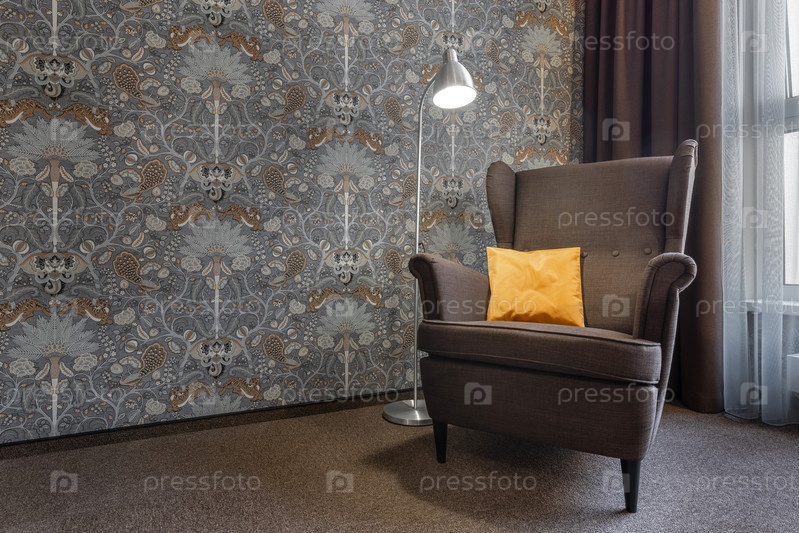 Удобный угол чтения с темным креслом, желтой подушкой, напольной лампой и элегантной серой обои рядом с окном со шторами