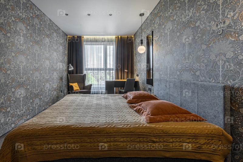 Современная спальня с уютной кроватью и оконным освещением