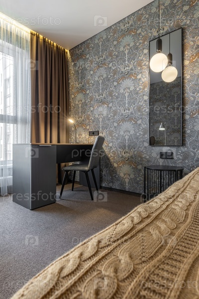 Современное рабочее пространство в спальне с деревянным столом, серым креслом, мягким освещением и декоративными обоями создает уютную атмосферу