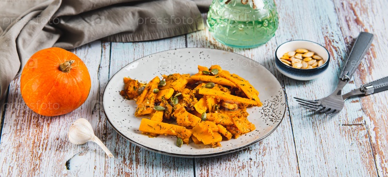 Пикантный салат с жареным тыквом, чесноком и травами на тарелке на столе веб-баннер