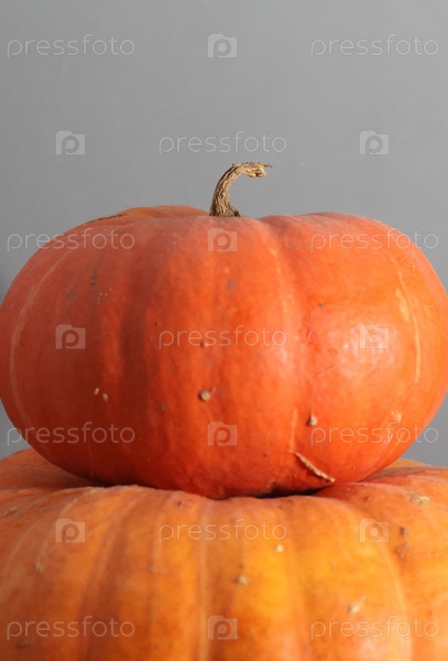 Две оранжевые тыквы одна над другой на сером фоне