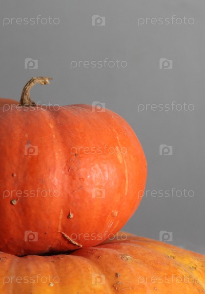 Две оранжевые тыквы одна над другой на сером фоне