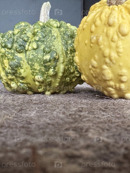 Две декоративные зеленые и желтые тыквы, расположенные на поверхности, покрытой мокрой грубой оболочкой, декоративные мини-тыки, взятые сверху