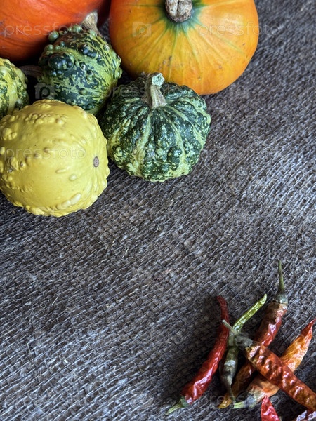 Тыквы разных цветов и размеров, Сушеные капсулы чили-перец, Установлены на поверхности, покрытой влажным грубым рыканьем, Снято сверху