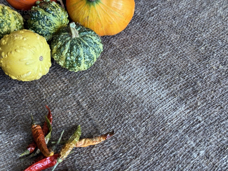 Тыквы разных цветов и размеров, Сушеные капсулы чили-перец, Установлены на поверхности, покрытой влажным грубым рыканьем, Снято сверху