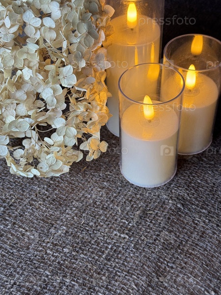 Яростно высушенный цветок гортензии, Он лежит рядом с тремя электрическими свечами с горящими фитилями на поверхности грубого мокрого льняного рыка