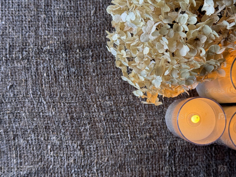 Яростно высушенный цветок гортензии, Он лежит рядом с тремя электрическими свечами с горящими фитилями на поверхности грубого мокрого льняного рыка
