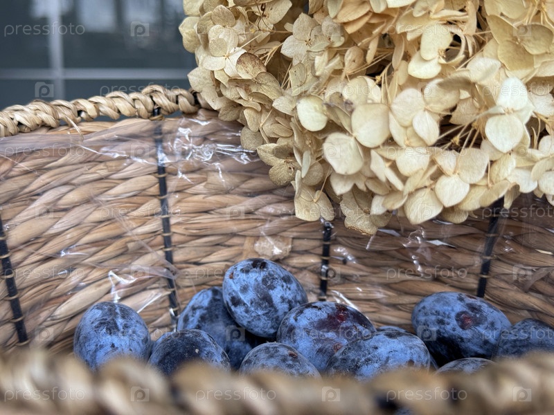 Зрелые голубые сливы в корзине из витка, пышный сушеный цветок гортензии на краю корзины