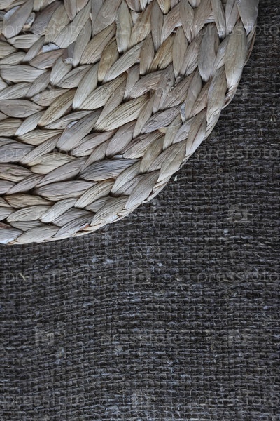 Две текстуры: грубая плетеновая ткань, возможно изготовленная из джута или сизаля, и плетеновый подставник или коврик, сделанный из другого природного материала, такого как водяной гиацинт или ратан