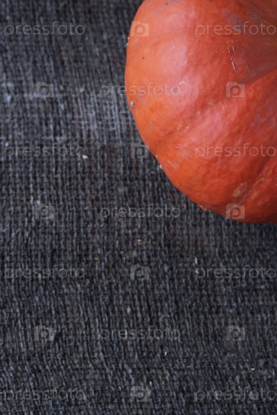 Фрагмент оранжевой тыквы на грубом льняном фоне