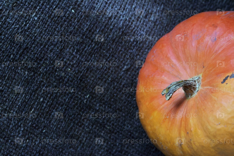 Фрагмент оранжевой тыквы на грубом льняном фоне