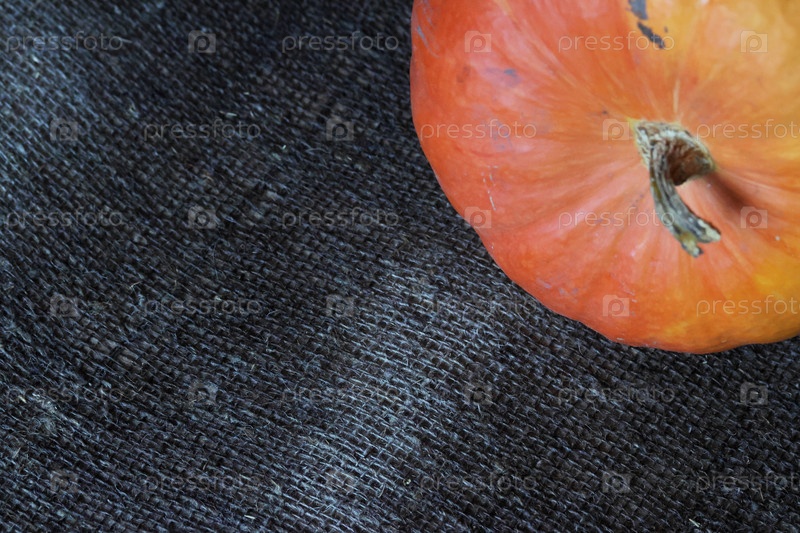 Фрагмент оранжевой тыквы на грубом льняном фоне