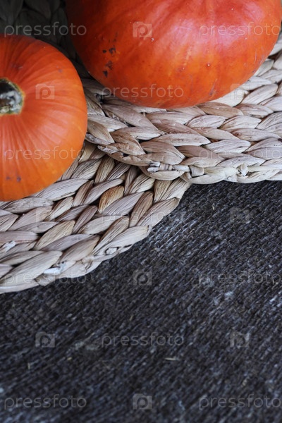 Фрагмент оранжевой тыквы на грубом льняном фоне