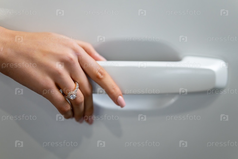 Ближайший снимок руки женщины со сверкающим обручальным кольцом, тянущейся за ручку двери автомобиля.Фотография подчеркивает роскошь, детали и современный стиль