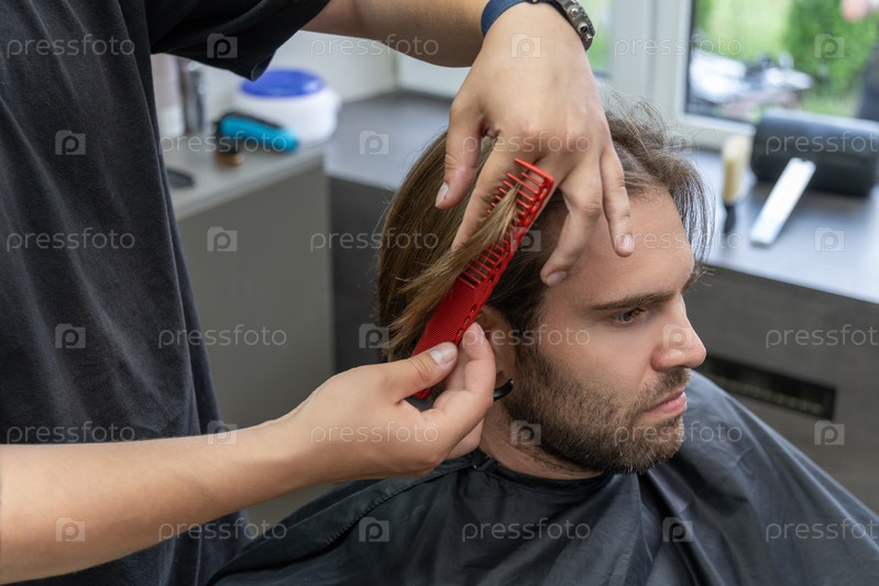 Парикмахер использует ножницы и красный гребень, чтобы подстричь мужчину с длинными светлыми волосами.Человек сидит в кресле парикмахера в защитном плаще со спокойным выражением лица