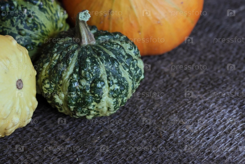 Тыквы разных цветов и размеров расположены на поверхности, покрытой влажным грубым рычанием