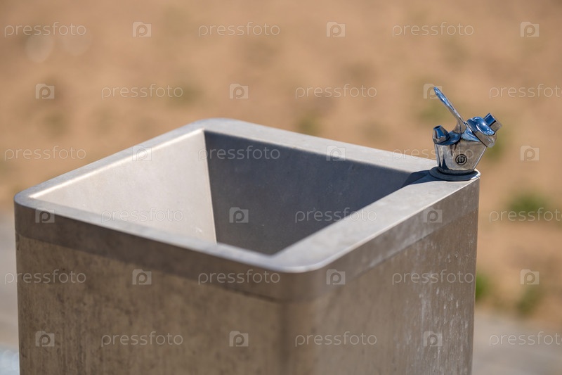 Чистый, статичный снимок пустого общественного фонтана из бетона и нержавеющей стали.Сцена разворачивается на открытом воздухе в яркий день с расплывчатым фоном